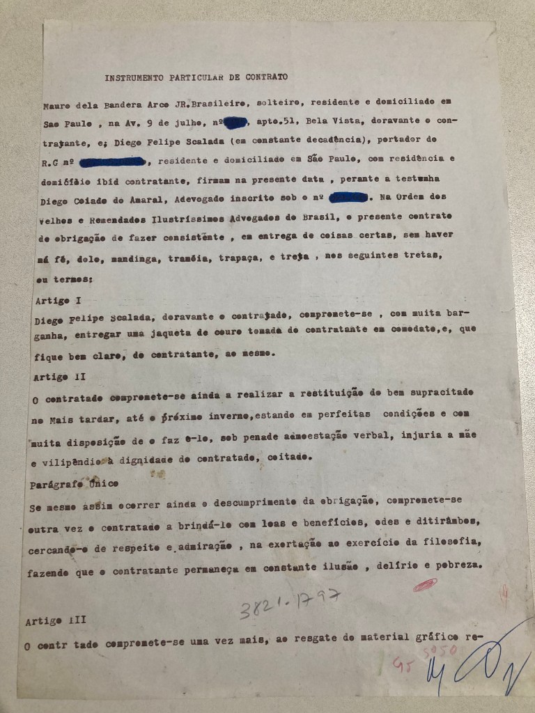 Eis que me peguei dia desses consultando, após um resgate improvável, alguns papéis datilografados entre 2012 e 2013, que remetiam a um período em que tínhamos, em nossa República da Bela Vista, uma Smith Corona – provavelmente da década de 1960 – repleta de pequenas avarias. Um desses arquivos, felizmente, foi salvo pelos descuidos daqueles tempos em que datilografávamos porcamente e quase tudo ia parar na lixeira. Tal registro, salvo aleatoriamente pela negligência de nosso desleixo, merece aqui a transcrição, por se tratar de uma atividade lúdica que cultivávamos naquela fase sub-satelital, em que orbitávamos a USP: lavrar contratos para atividades triviais, cotidianamente bestas. Desde lavar a louça até combinar as faxinas: tudo era objeto de contratos redigidos ao sabor ligeiro de nossos humores e da disposição de escrever para apenas escrever. O que valia naquele então era o advento lúdico daqueles hoje saudosos momentos.