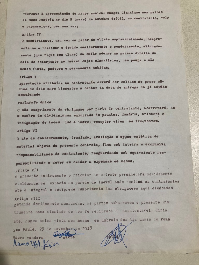 O contratado compromete-se, uma vez mais, ao resgate do material gráfico referente à apresentação do grupo musical Onagra Claudique nos palcos do Sesc Pompeia no dia 9 (nove) de outubro de 2012, para o contratante, vulgo Papaura que, por sua vez;